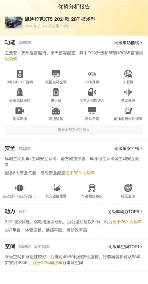 这辆凯迪拉克XT5 2021款 28T 技术型有皮织混搭座椅、单天窗等配置,从安全配置方面来看,标配主动刹车/主动安全系统、前方碰撞预警、车身稳定系统等主动安全配置,配备6个安全气囊,被动安全配置优于70%同级车。从动力方面来看,搭载了2.0T 直列4缸,涡轮增压发动机,百公里加速仅8.0s,动力优于76%同级车。从空间方面来看,后排可40:60比例放倒座椅,行李厢容积可从584L扩容到1634L,优于72%同级车行李厢空间。