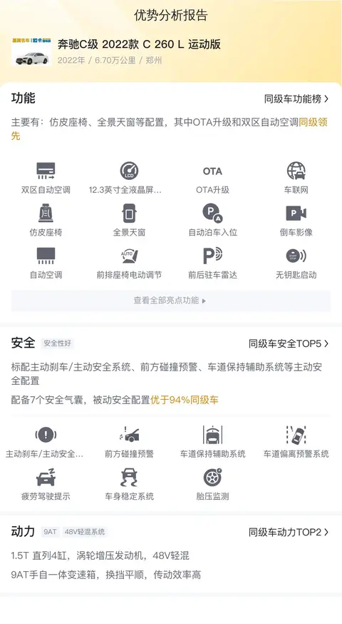 选购二手车,不仅要关注车况,还要考量市场行情与用车成本。这款二手奔驰C级的报价为21.58万,首付仅需6.5万,就能让这位“白富美”跟你回家。在用车成本方面,它就像个勤俭持家的贤内助,平均每年的花费大约13763元,对于一个豪华品牌来说,这是相当的合理了。