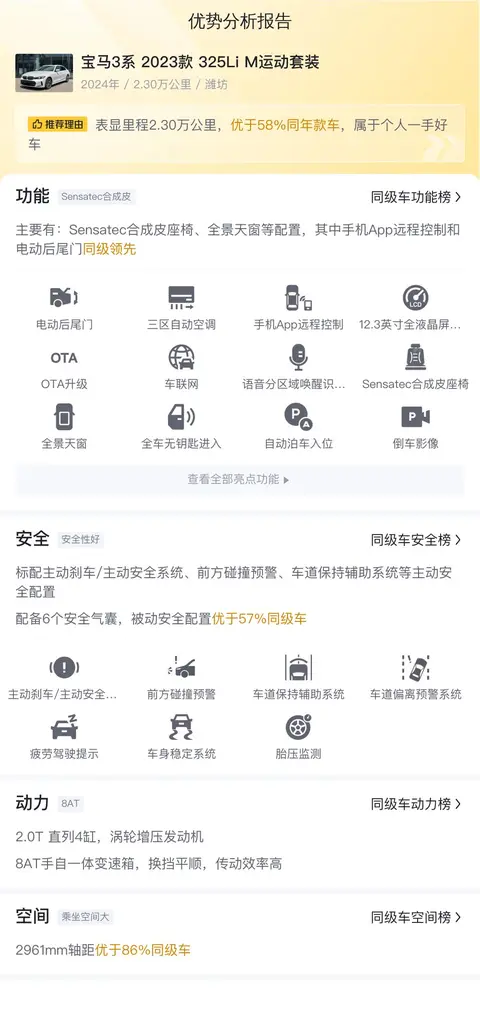 综上所述,作为一款二手车源的宝马3系 2023款 325Li M运动套装,它的车龄并不高,而且行驶里程也较少,车况保持的很好,且宝马3系一直是运动与操控的代名词,喜欢这类车型的朋友可以放心选购。不过,这辆车目前的售价还是有点偏高,但考虑到现在买车首付只需6.2万就可以开回家,还是让很多没有这么多启动资金的朋友可以先用车后还款,压力小了很多。