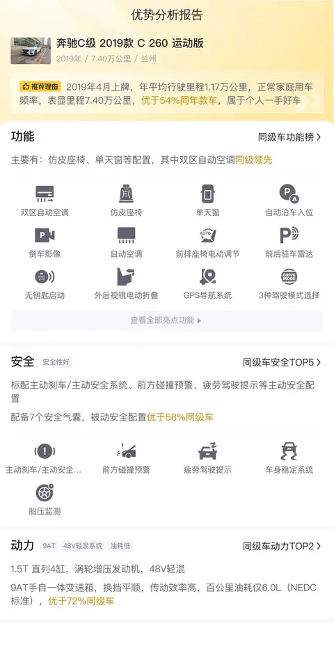 该车具体版本为2019款奔驰C 260运动版,2019年4月上牌,跑了7.4万公里,地点在兰州,白色外观,国VI排放标准,未曾过户。新车指导价31.08万,如今二手车报价14.98万。