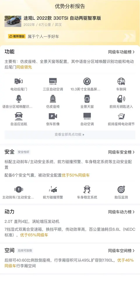 途观L 2022款 330TSI 自动两驱智享版拥有仿皮座椅、全景天窗等配置,其中语音分区域唤醒识别功能和电动后尾门同级领先。动力方面,搭载2.0T直列4缸,涡轮增压发动机,匹配7挡湿式双离合变速箱,百公里油耗仅为6.6L,优于65%同级车。