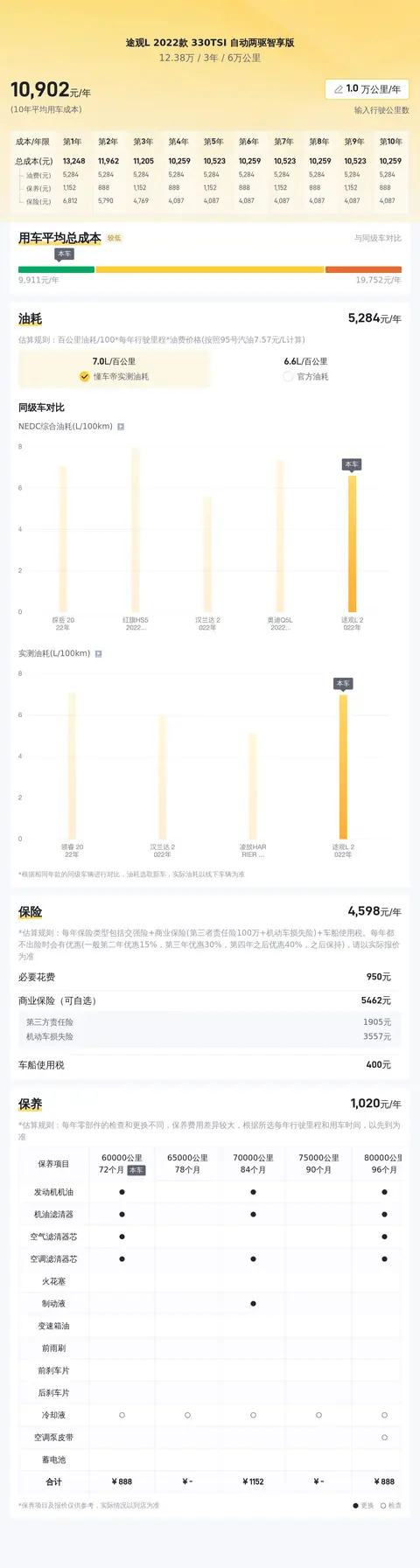 基于懂车帝对途观L 2022款 330TSI 自动两驱智享版的分析,我们得出其10年平均用车成本大约为11447元/年,这是一个适中的成本支出,与同类车型相比表现合理。值得注意的是,实际费用可能会因驾驶习惯、行驶里程以及油价波动等因素而有所不同。