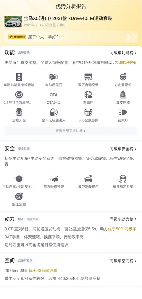 该车是一款宝马X5(进口) 2021款 xDrive40i M运动套装,外观颜色为白色,内饰颜色为深色。车源地和上牌地均为佛山。至今累计行驶里程约为8.7万公里,该车符合国VI排放标准,无过户记录。新车指导价为75.99万,现卖家报价为34.38万,于2021年4月首次上牌。