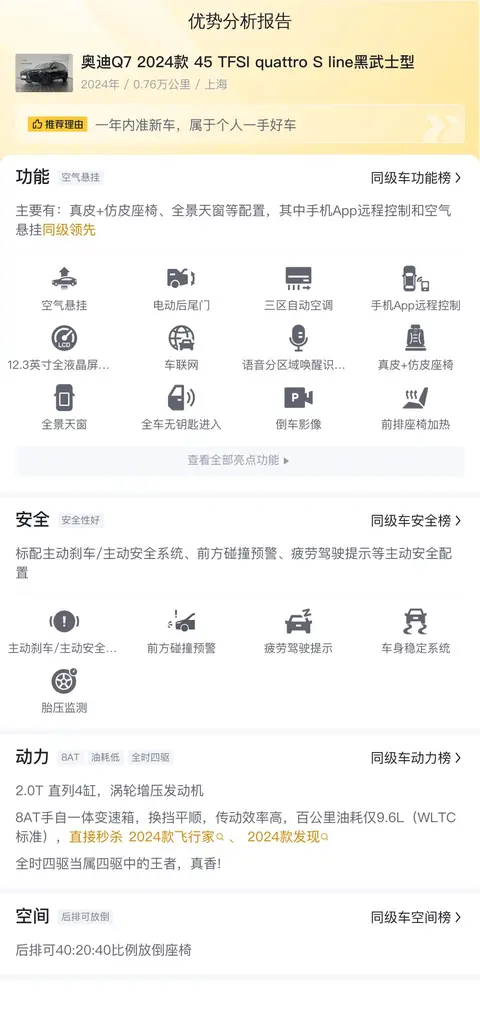 在选择一辆车的时候,我们不仅要考虑它的购买价格,还要仔细算一笔长期使用的账。根据大数据分析,这辆奥迪Q7 2024款 45 TFSI quattro S line黑武士型的10年平均用车成本大约在每年2万元左右。这个数字包含了油费、保养费、保险费等日常用车的所有开支。当然,具体的费用还会根据你的用车习惯和地区的消费水平有所变动。