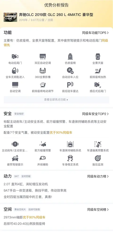 现在,我们来一起看一辆二手奔驰GLC 2019款 GLC 260 L 4MATIC 豪华型。这辆车的上牌地是沈阳,上牌日期为2019年6月,表显里程为9.67万公里,新车指导价为43.48万,卖家现在的报价为16.8万,过户次数为1次。车源地与上牌地一致,节省用车成本,方便售后保障。