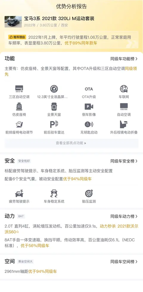 综上所述的新车含税价、用车成本、市场行情、优势分析、同款比价等数据仅供参考。在配置部分,因为二手车非标品,车辆可能会存在配置改装的情况,具体车况信息需要线下结合车辆实际情况进行综合参考。