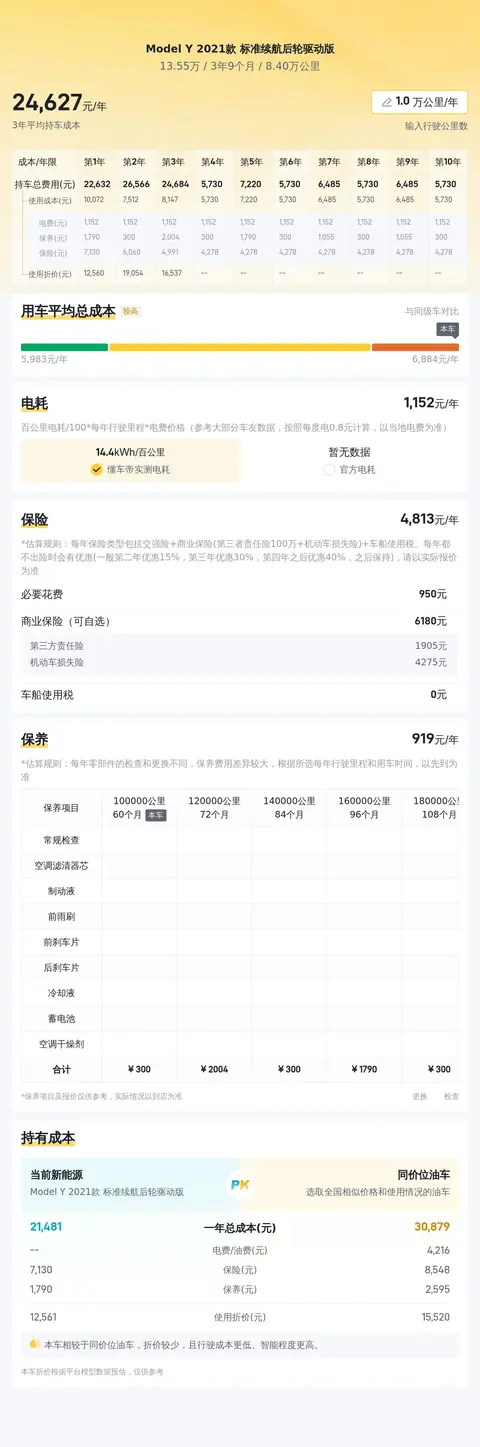 另外,同级车的最低10年平均用车成本是5733元/年,最高是43710元/年,Model Y 2021款 标准续航后轮驱动版是25313元/年,是适中的水准。