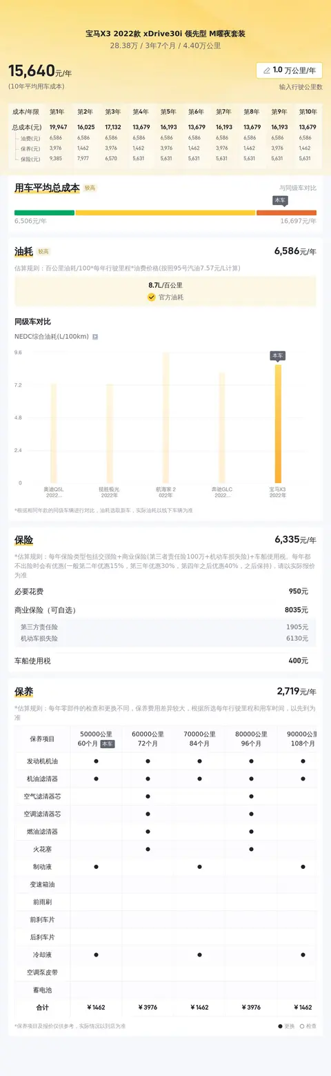 接下来,我们将为您详细解析这款2022款宝马X3 xDrive30i 领先型 M曜夜套装的平均用车成本。根据懂车帝的专业分析,该车型的10年平均用车成本约为16,578元/年。这一数字基于多种因素计算得出,包括油耗、保险费用、保养成本以及可能出现的维修费用等。其中,燃油费用大约为10,119元/年,保险费用约为5,028元/年,保养费用则约为1,031元/年。重要的是要注意,实际用车成本可能会根据您的驾驶习惯、车辆使用频率、油价波动、保险政策以及车辆维护情况等因素而有所变化。此外,如果您选择了商业保险而非基本的交强险,保费可能会更高。在购买二手车时,请务必考虑这些长期成本,以确保您的预算能够覆盖车辆的全部使用费用。