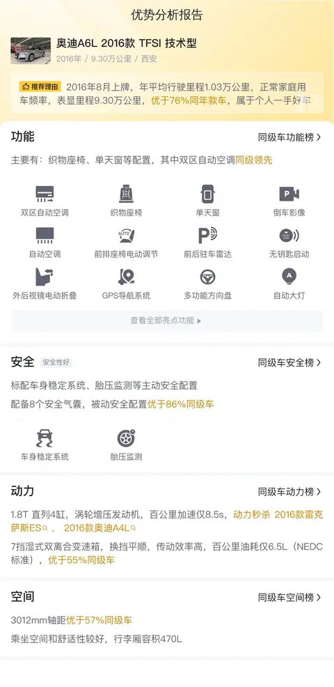 在选择二手车时,了解车辆的全方位表现至关重要。接下来,我们将从安全性、动力性能、舒适度及空间四个方面,将奥迪A6L 2016款 TFSI 技术型与同级别车型进行细致对比。这样的深度分析,旨在帮助您更全面地把握这款车的整体性能,为您的购车决策提供有力参考。
