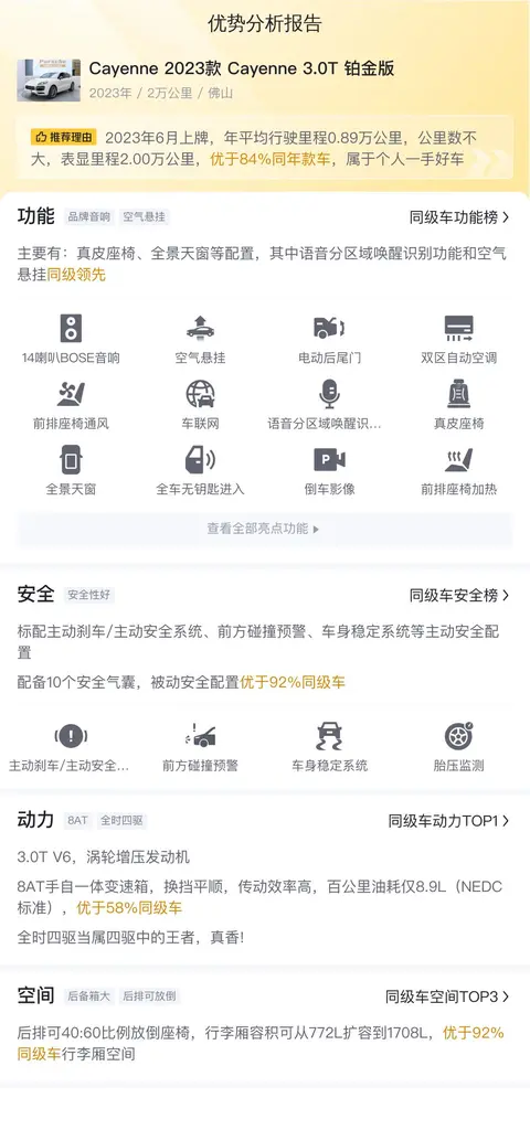 据估算,同级车的最低用车成本是18781元/年,最高是40716元/年,Cayenne 2023款 Cayenne 3.0T 铂金版是25155元/年,用车成本适中。