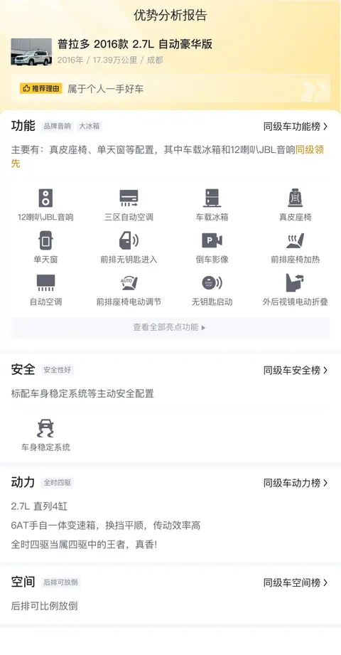 为了更清晰地向潜在买家展示这辆普拉多在配置、安全、动力、空间等方面与其竞争对手的对比情况,我们进行了深入的分析和比较。
