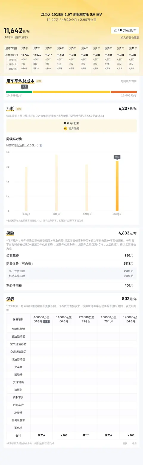 在用车成本方面,根据懂车帝的估算,这辆汉兰达的年均综合用车成本约为1.2万元。具体成本会根据车主的驾驶习惯、用车频率、油价波动等因素而有所不同。但是,相对于同级别车型来说,汉兰达2018款2.0T两驱精英版5座国V的用车成本还是比较合理的。