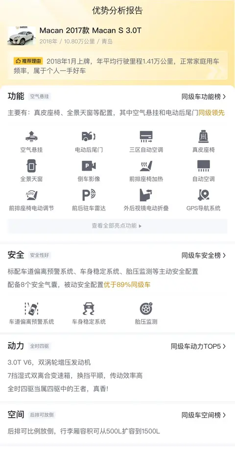 缺点:作为豪华车型,Macan 2017款 Macan S 3.0T的维护和保养成本相对较高,需要使用较高质量的油品和配件。其后排空间相对较为局促,对于后排乘客的舒适性可能会有一定的影响。该款车型已经相对较老,可能已经错过了最佳的二手车出手时机,未来可能还会进一步贬值。该车没有检测报告,建议参考专业检测报告后再做决定。