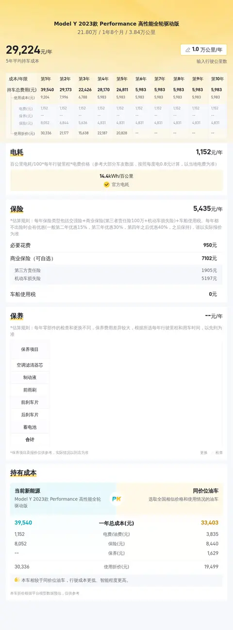 在二手车市场上,Model Y 2023款 Performance 高性能全轮驱动版的售价通常在21.8万元左右。具体的售价会受到车辆状况等因素的影响。关于用车成本方面,该车型的百公里耗电量为14.4kWh,按每年行驶2万公里计算,电费约为600元。保险费用每年约6400元,保养费用每年约1800元,年洗车费用预估1000元。总体来看,Model Y 2023款 Performance 高性能全轮驱动版的使用成本相对合理,但对于部分用户来说,保养和洗车费用可能较高。