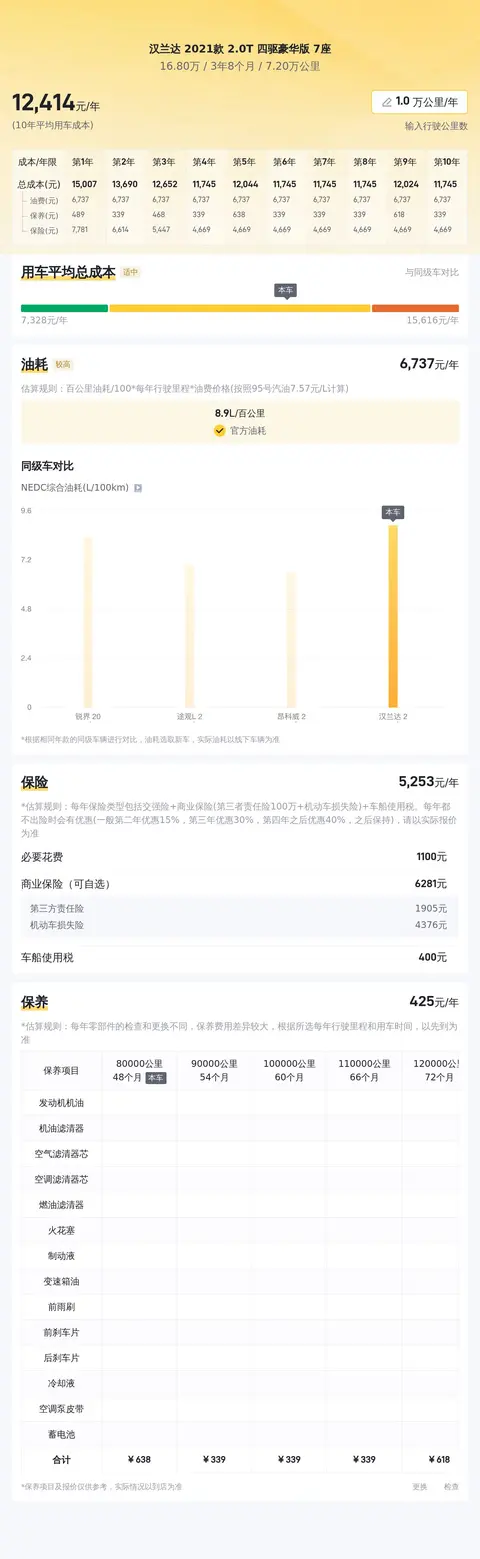 据估算,汉兰达 2021款 2.0T 四驱7座豪华版的用车成本是12466元/年,同级车最低是10428元/年,最高是16482元/年,所以用车成本偏高。