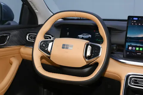 进入车内,吉利银河星耀6采用吉利银河新一代家族式座舱设计,整体使用双色搭配,提供澄湖映雪白、苏堤暖棕、烟雨墨黛三款内饰风格。中控台配备10.2英寸嵌入式液晶仪表、14.6英寸悬浮式中控屏、双辐平底方向盘以及怀挡式换挡杆等,搭载全新银河Flyme Auto智能座舱系统、AI大模型助⼿及吉利自研7纳米车规级芯片,在副仪表台区域设计有储物槽和物理按键+旋钮的多功能控制区。