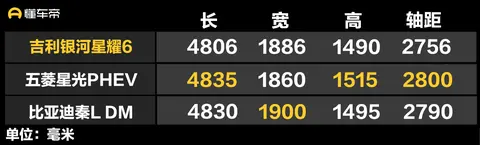 吉利银河星耀6与部分插混中型车对比