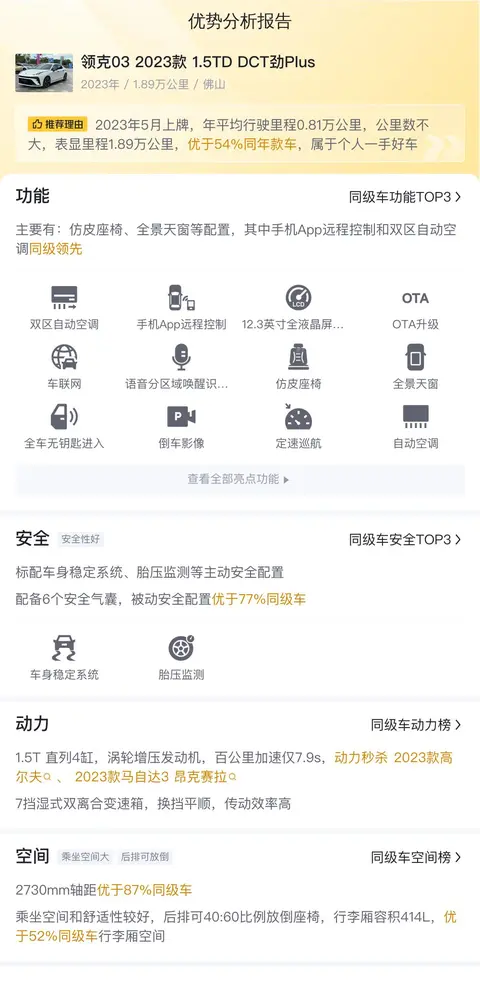 这辆2023款领克03 1.5TD DCT劲Plus首次上牌时间为2023年5月,车源地和车牌地均为佛山,至今行驶里程为1.89万公里,车身白色,国VI排放标准,无过户记录。新车指导价为12.78万元,目前二手车报价为10.88万元。