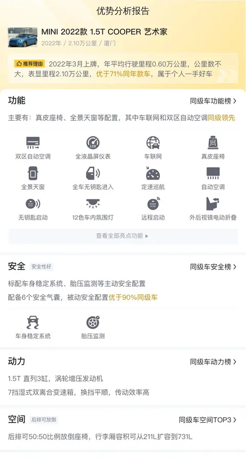 这辆MINI 2022款 1.5T COOPER 艺术家的优势之一就是外观,经典的造型,彩绘的拉花,一眼吸引眼球。其次就是配置,主动刹车/主动安全系统、前方碰撞预警、疲劳驾驶提示、6个安全气囊都有,安全性照顾的比较到位。最后就是内饰了,保护得很好,基本上没什么磨损,这个也不能算优点,不过如果去线下看车,肯定能给人惊喜。
