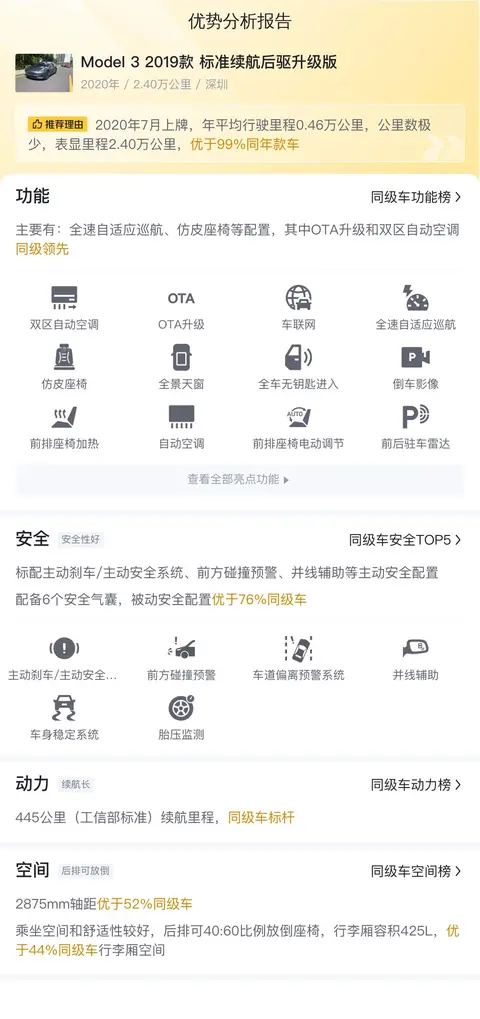 综上所述,这辆二手Model 3 2019款 标准续航后驱升级版在各个方面都表现出了较高的水准。作为一款纯电动车型,它在续航里程、动力性能等方面都有着出色的表现,同时在功能配置、车身尺寸、空间等方面也能满足大多数用户的需求。如果您正在寻找一款性价比高、使用成本低的纯电动车型,那么这辆二手Model 3无疑是一个值得考虑的选择。