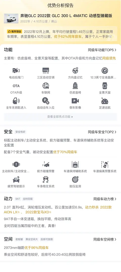 奔驰GLC(图片|配置|询价) 2022款 GLC 300 L 4MATIC 动感型臻藏版是一款豪华SUV,具有出色的驾驶性能和舒适的乘坐体验。它搭载了2.0T发动机和9挡手自一体变速箱,提供了强劲的动力和顺畅的操控。四驱系统和空气悬挂系统则分别增强了车辆的越野能力和行驶稳定性。配置方面,它配备了智能驾驶辅助系统、高级音响和全景天窗等高端配置,提升了驾驶安全性和舒适性。这款车于2022年12月在佛山上牌,至今行驶了4.1万公里,个人一手车。原价49.55万,现价26.98万,白车黑顶,外型霸气,非常值得入手。