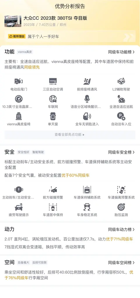 综上所述的新车含税价、用车成本、市场行情、优势分析、同款比价等数据仅供参考。在配置部分,因为二手车非标品,车辆可能会存在配置改装的情况,具体车况信息需要线下结合车辆实际情况进行综合参考。