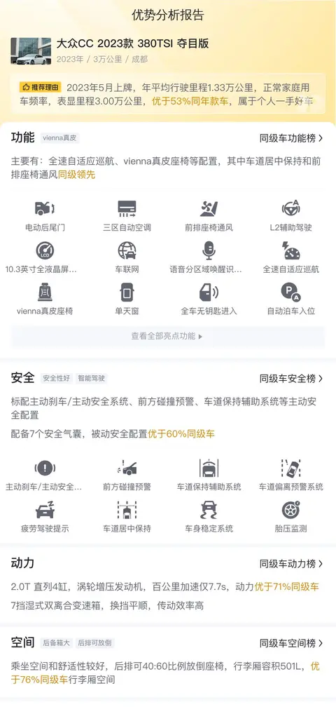 综上所述的新车含税价、用车成本、市场行情、优势分析、同款比价等数据仅供参考。在配置部分,因为二手车非标品,车辆可能会存在配置改装的情况,具体车况信息需要线下结合车辆实际情况进行综合参考。