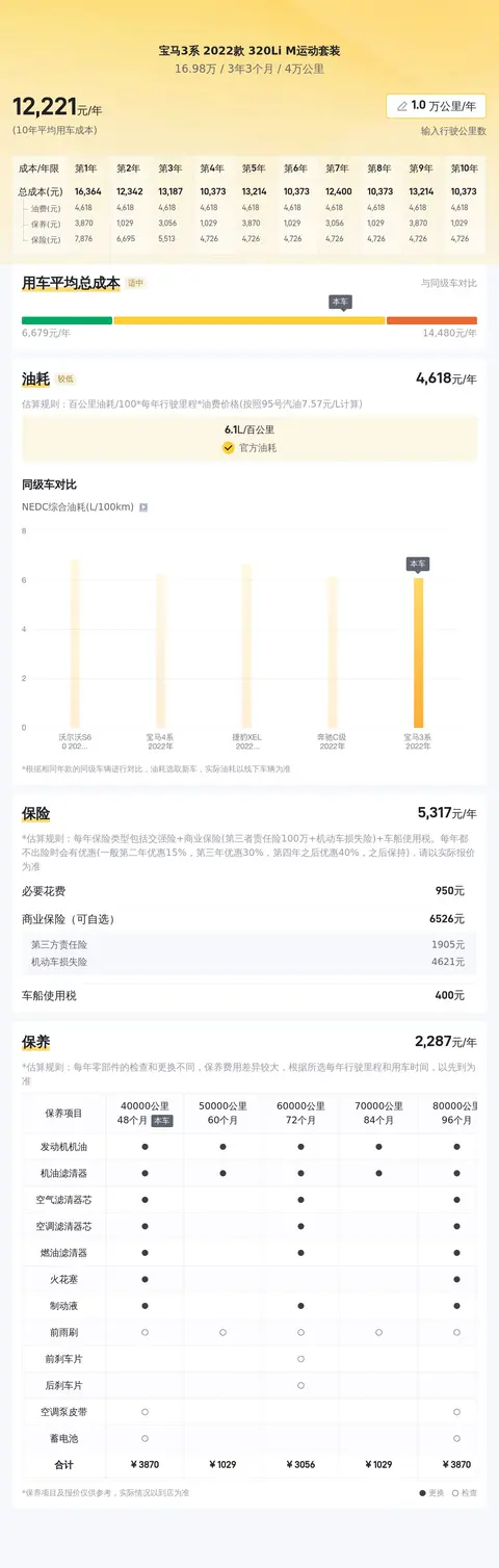 宝马3系 2022款 320Li M运动套装这款车型百公里油耗为6.1升,按照一年行驶2万公里计算,燃油费用约为10664元。保险费用方面,一年大约需要5268元,包括交强险、商业险等。保养费用方面,一年大约需要3108元,包括车辆的日常维护和定期保养。其他费用方面,停车费、洗车费、过路费、罚款等一年大约需要3108元。综上所述,宝马3系 2022款 320Li M运动套装一年的用车成本大约为22155元,这个用车成本跟车主的用车习惯有直接关系,每个人的用车成本是不一样的,有的人用车频率较高,用车成本就会高一些,有的人喜欢单位车,用车成本就会低一些,这个需要根据自己的用车习惯进行测算。