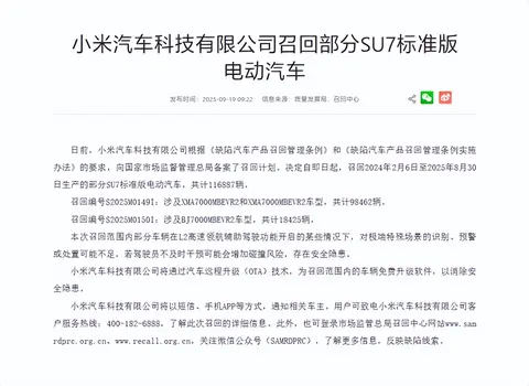 一场涉及近12万辆电动车的召回行动,将小米汽车推至舆论漩涡中心。9月19日,国家市场监督管理总局官网披露,小米汽车科技有限公司因L2高速领航辅助驾驶功能在“极端特殊场景”下存在风险,主动备案召回计划。据悉,此次召回覆盖2024年2月至2025年8月期间生产的小米SU7(图片|配置|询价)标准版部分车型,总量高达116,887辆。