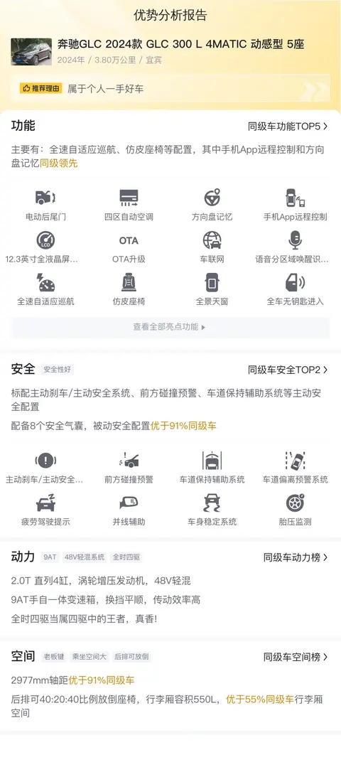 在竞争激烈的汽车市场中,每一款车型都以其独特的魅力和卓越的性能吸引着消费者的目光。而今天,我们要谈的是一款特殊的车型——奔驰GLC 2024款 GLC 300 L 4MATIC 动感型。这款车在众多同级别车型中脱颖而出凭借的是多项杰出配置。首先,它搭载的2.0T直列4缸涡轮增压发动机配合48V轻混系统为车辆提供了充沛的动力输出同时兼顾了燃油经济性。其次,9挡手自一体变速箱不仅提供了平顺的换挡体验还优化了传动效率让驾驶者能够更加专注于驾驶乐趣。再次,全时四驱系统则是这款车的另一大亮点它能够在各种复杂路况下为驾驶者提供稳定的操控性和出色的通过性。此外,宽敞舒适的内部空间、先进的智能驾驶辅助系统以及高品质的内饰材料都进一步提升了这款车的竞争力。最后,奔驰GLC 2024款 GLC 300 L 4MATIC 动感型还配备了丰富的智能驾驶辅助系统如全速自适应巡航、车道居中保持、L2辅助驾驶等为驾驶者提供了全方位的安全保障。综合来看奔驰GLC 2024款 GLC 300 L 4MATIC 动感型凭借其卓越的动力性能、出色的操控稳定性、宽敞舒适的内部空间以及先进的智能驾驶辅助系统在同级别车型中难觅敌手。