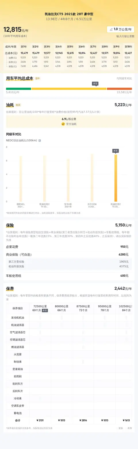 本次我们要介绍的是一款凯迪拉克CT5 2021款 28T 豪华型,属于中配版本。自2021年1月上牌以来,行驶里程为6.51万公里,年平均行驶里程为2.17万公里,这个里程数对于一辆轿车来说较为合理。考虑到2021款 CT5的标准油品为95号汽油,结合其压缩比和发动机技术,我们预计其百公里油耗在7升左右,这在同级别车型中表现优秀。该车目前报价为13.98万元,相比新车指导价优惠了16万元,显示出较高的性价比。此外,车辆有过两次过户记录,这在二手车市场中较为常见,通常不会影响到车辆的使用和保养。
