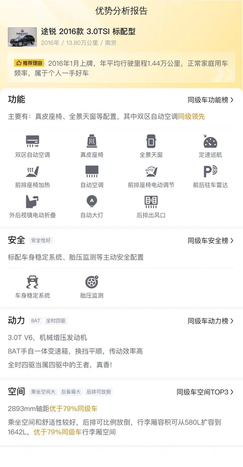 以上就是对这款二手途锐 2016款 3.0TSI 标配型的详细介绍,如果您喜欢,欢迎交流。