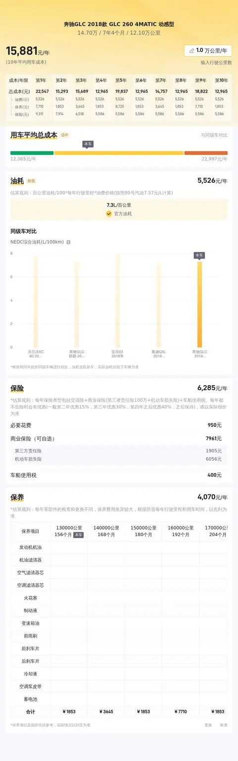 根据懂车帝的数据,这辆奔驰GLC 2018款 GLC 260 4MATIC 动感型的二手市场行情较为稳定。其综合性价比指数为59%,其中保值率指数和安全指数表现较为出色。在用车成本方面,按照每年 2 万公里行驶里程计算,10 年平均用车成本约为 31,685 元/年。相比之下,同级别车型的最低 10 年平均用车成本约为 26,801 元/年,最高则可达 40,992 元/年。从长远来看,这辆车的用车成本相对合理,对于追求性价比的消费者来说,它是一个不错的选择。