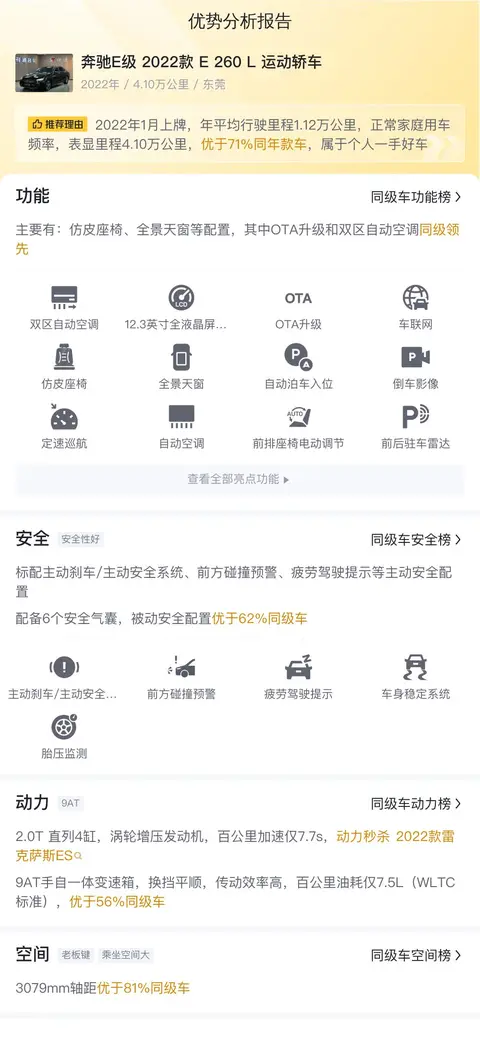 今天介绍的这款2022款奔驰E 260 L运动轿车,不仅继承了奔驰一贯的豪华与舒适,更在动力与操控上实现了完美平衡。作为一款精心维护的二手车源,它的每一次加速与换挡,都透露着前主人对它的爱护与尊重。这款车不仅是一款交通工具,更是一种生活态度的展现,等待着下一个有缘人来继续书写它的故事。