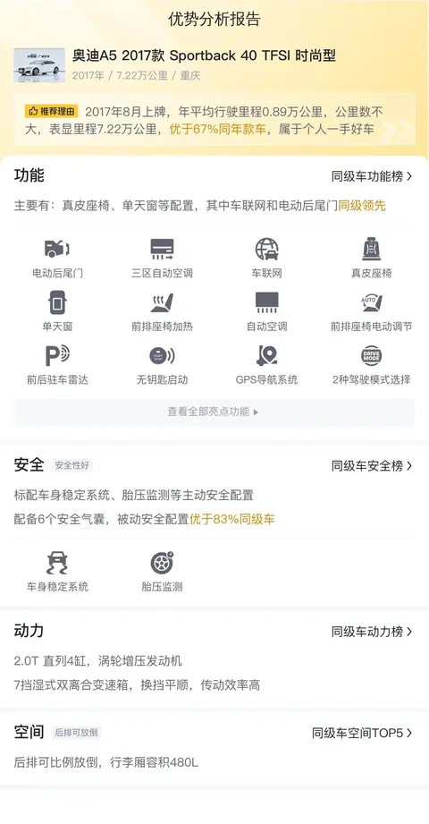 综上所述,这辆二手奥迪A5在车况检测、配置分析、市场行情等方面均表现出色。虽然外观存在一些瑕疵,但并不影响车辆的整体使用和安全性。在配置方面,该车配备了众多实用功能,如定速巡航、前后驻车雷达等,为驾乘者提供了便捷和舒适的体验。从市场行情来看,该车13.68万的售价在同类车型中属于较为合理的价格区间。总体而言,这是一辆性价比不错、值得考虑的二手车选择。