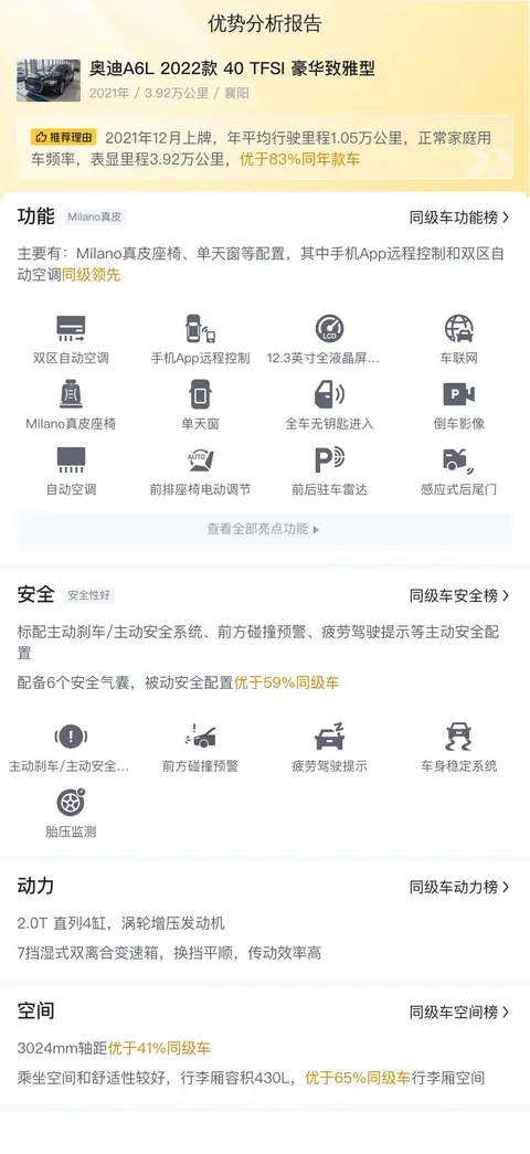 缺点是,这款车子油耗并不低,用车成本会比较高。而且车子曾经过户过一次,属于二次过户车,这一点可能很多人会觉得不理想。另外,这款车子的新车价格比较高,普通人买新车压力大,买二手车的话,又担心车子的实际情况不好,所以会比较犹豫。综合车况来看,这款车子其他并没什么问题,只是每个人对于车子的要求不同,有的人更看重车子的性能,有的人却更看重使用的成本,对比竞品车型,这款奥迪A6L配置一般,但是空间表现不错。