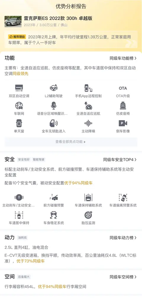 优势:雷克萨斯ES一直以来都有着较好的口碑,品质过硬,故障率低,而且省油,是一款适合日常使用的高品质轿车。这款雷克萨斯ES 2022款 300h 卓越版配置丰富,使用不多,价格实惠,是一款不错的二手车选择。