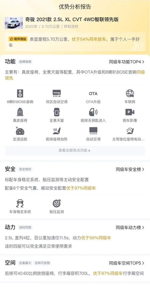 奇骏 2021款 2.5L XL CVT 4WD 智联领先版在配置、性能、空间布局及性价比等方面均表现出色,是一款值得推荐的二手车选择。