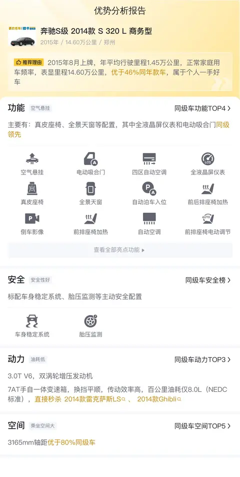 据估算,同级车的最低用车成本是18783元/年,最高是43720元/年,奔驰S级 2014款 S 320 L 商务型是21354元/年,用车成本不算低,但和同级别车相比又是正常的。