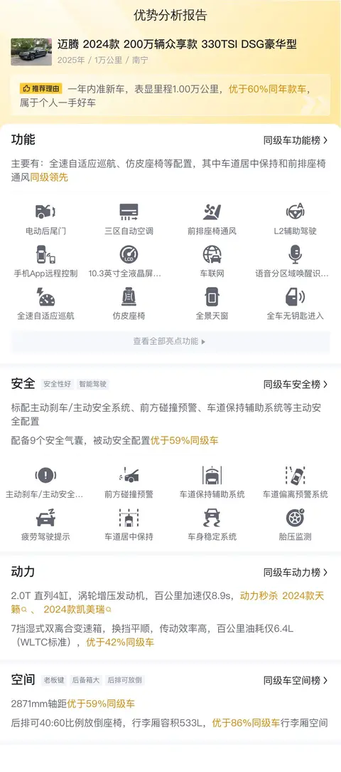 综上所述的新车含税价、用车成本、市场行情、优势分析、同款比价等数据仅供参考。在配置部分,因为二手车非标品,车辆可能会存在配置改装的情况,具体车况信息需要线下结合车辆实际情况进行综合参考。