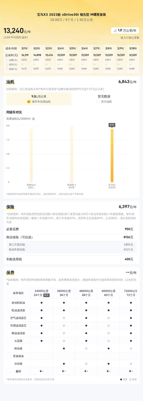 有购车想法的朋友肯定关心买车之后的花销,根据估算,该车10年平均用车成本约13,270元/年,油车嘛,花销也属正常。这辆车需要定期保养,每年大约5千多的保养费用,保险一年约5千出头,除此之外的花销就算停车费洗车费之类的了,具体金额就因人而异了。