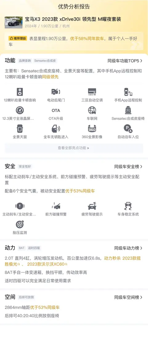 该车是宝马X3 2023款 xDrive30i 领先型 M曜夜套装,车源地是杭州,上牌时间是2024年12月,实表里程是1.9万公里,车身颜色是黑色,没有过户记录。新车含税价48.45万,现在的二手车报价是28.88万。