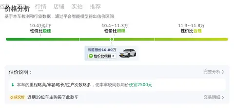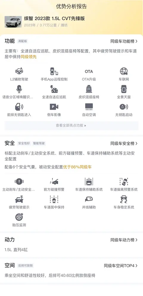 参考现在10.8万的二手卖价,其实这辆缤智 2023款 1.5L CVT先锋版性价比蛮高的,毕竟是一辆里程不到4万公里,车龄只有一年半的2023款中配缤智;而且这个版本相对入门版增加了不少实用配置,比如全景天窗、手机App远程控制、语音分区域唤醒识别等等,都是平时能用得上,甚至会经常使用的功能。如果您正好想买一辆小型SUV,那这辆缤智 2023款 1.5L CVT先锋版值得考虑。