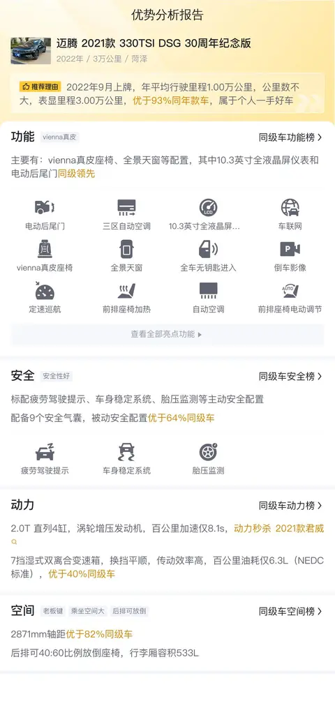 这款迈腾 2021款 330TSI DSG 30周年纪念版车源地是菏泽,上牌日期2022年09月,表显里程3万公里,新车含税价25.53万,二手车报价12.88万。该车与新车相比便宜12.65万,约6.1折。外观为黑色,内饰为深色,可迁异地落户,此车没有过户记录。