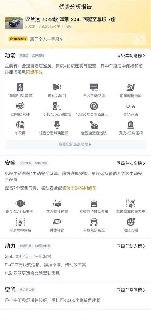 汉兰达 2022款 双擎 2.5L 四驱至尊版 7座从名字上就能看出来有很多亮点配置,配备了全速自适应巡航、第二排电动调节等配置,其中车道居中保持和前排座椅通风更是同级领先。安全配置上,标配主动刹车/主动安全系统、前方碰撞预警、车道保持辅助系统等主动安全配置,配备7个安全气囊,被动安全配置优于96%同级车。