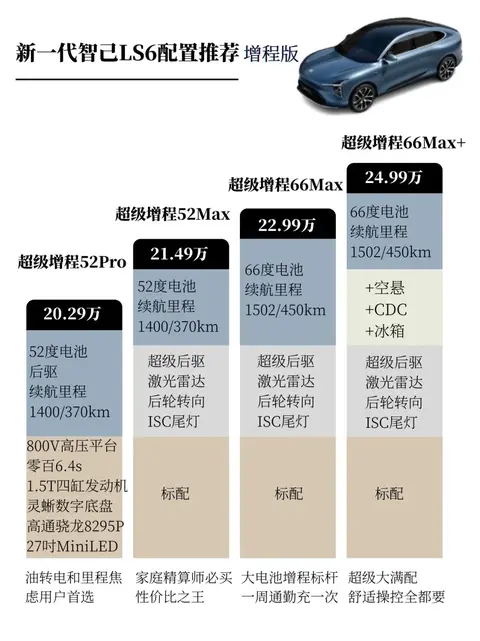 增程版推荐 66Max 版:权益价 22.99 万元,450km 的纯电续航对于日常城市通勤完全足够,15 分钟补能 310km 的快充能力也很出色,且整体主动转向系统、激光雷达、前排座椅通风加热按摩、后排座椅加热等配置丰富,对于家庭用户来说特别实用。