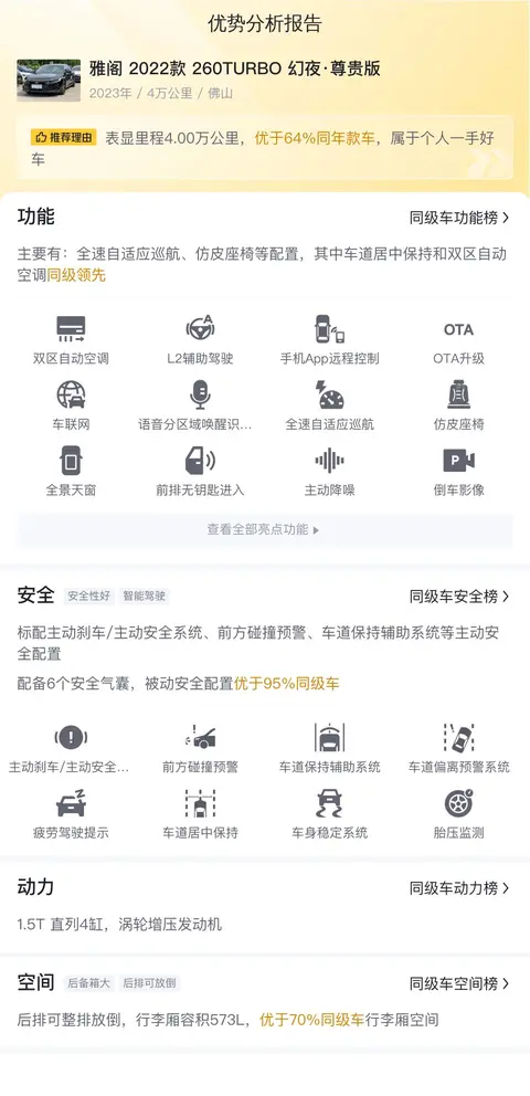 综上所述的新车含税价、用车成本、市场行情、优势分析、同款比价等数据仅供参考。在配置部分,因为二手车非标品,车辆可能会存在配置改装的情况,具体车况信息需要线下结合车辆实际情况进行综合参考。