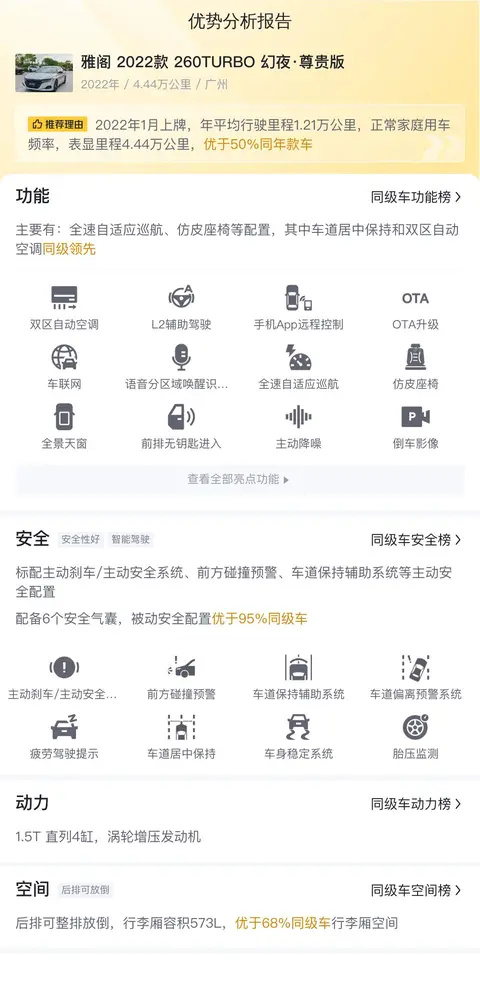 综上所述的新车含税价、用车成本、市场行情、优势分析、同款比价等数据仅供参考。在配置部分,因为二手车非标品,车辆可能会存在配置改装的情况,具体车况信息需要线下结合车辆实际情况进行综合参考。