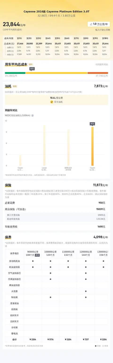 据估算,同级车的最低用车成本是17788元/年,最高是43779元/年,Cayenne 2016款 Cayenne Platinum Edition 3.0T是23678元/年,用车成本适中,同时和同级车相比,也比较有优势。