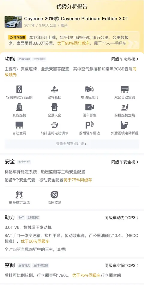 这辆Cayenne 2016款 Cayenne Platinum Edition 3.0T的市场行情价是30.82万- 38.17万,它的报价则是32.88万,报价偏低,同时它的保值率也高于同级车,也是因为里程少于同级车,所以保值率才高。